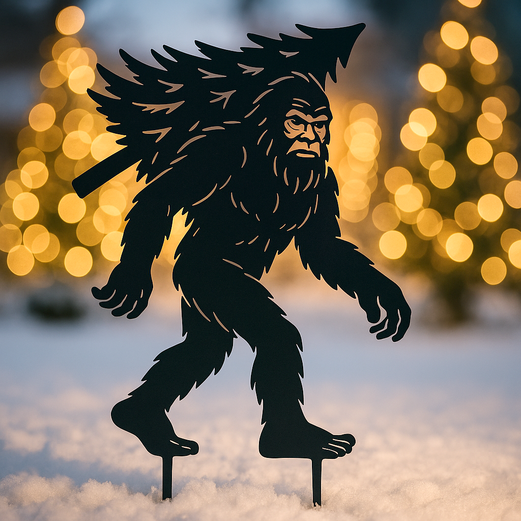 ✨Made from sturdy black metal with crisp laser-cut edges, the silhouette stands out beautifully against snow, lights, and holiday décor. Whether daytime or under twinkling Christmas lights at night, Bigfoot and his festive tree create a magical outdoor scene that feels fun, mysterious, and totally unique.