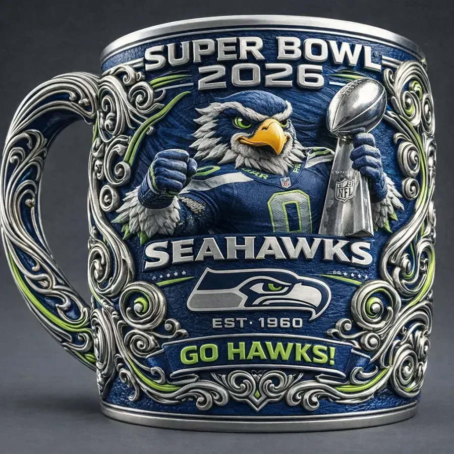 🦅🏆Celebrate the ultimate victory with this Super Bowl 2026 Seahawks Champion Mug—a bold tribute to dominance, legacy, and unwavering fandom. Featuring a heroic hawk clutching the Lombardi Trophy, iconic team colors, and “GO HAWKS!” pride front and center, this mug turns every sip into a championship moment.